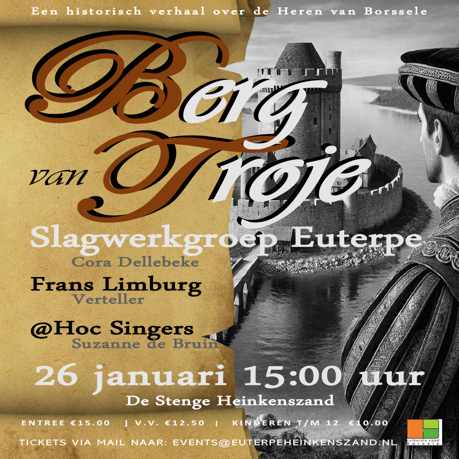Wilt u weten hoe dit verhaal verloopt en waar de Berg van Troje te vinden is? Kom dan op zondag 26 januari 2025 kijken en luisteren naar het concert 'Berg van Troje' in de sporthal van de Stenge in Heinkenszand. Het begint om 15u00.