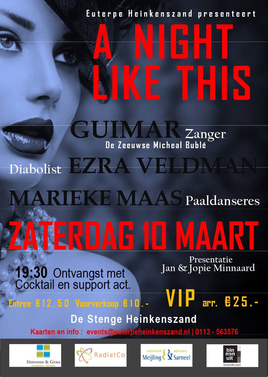 U kunt onze nachtclub "A night like this" bezoeken in ons Euterpetheater in de Stenge op zaterdagavond 10 maart as.