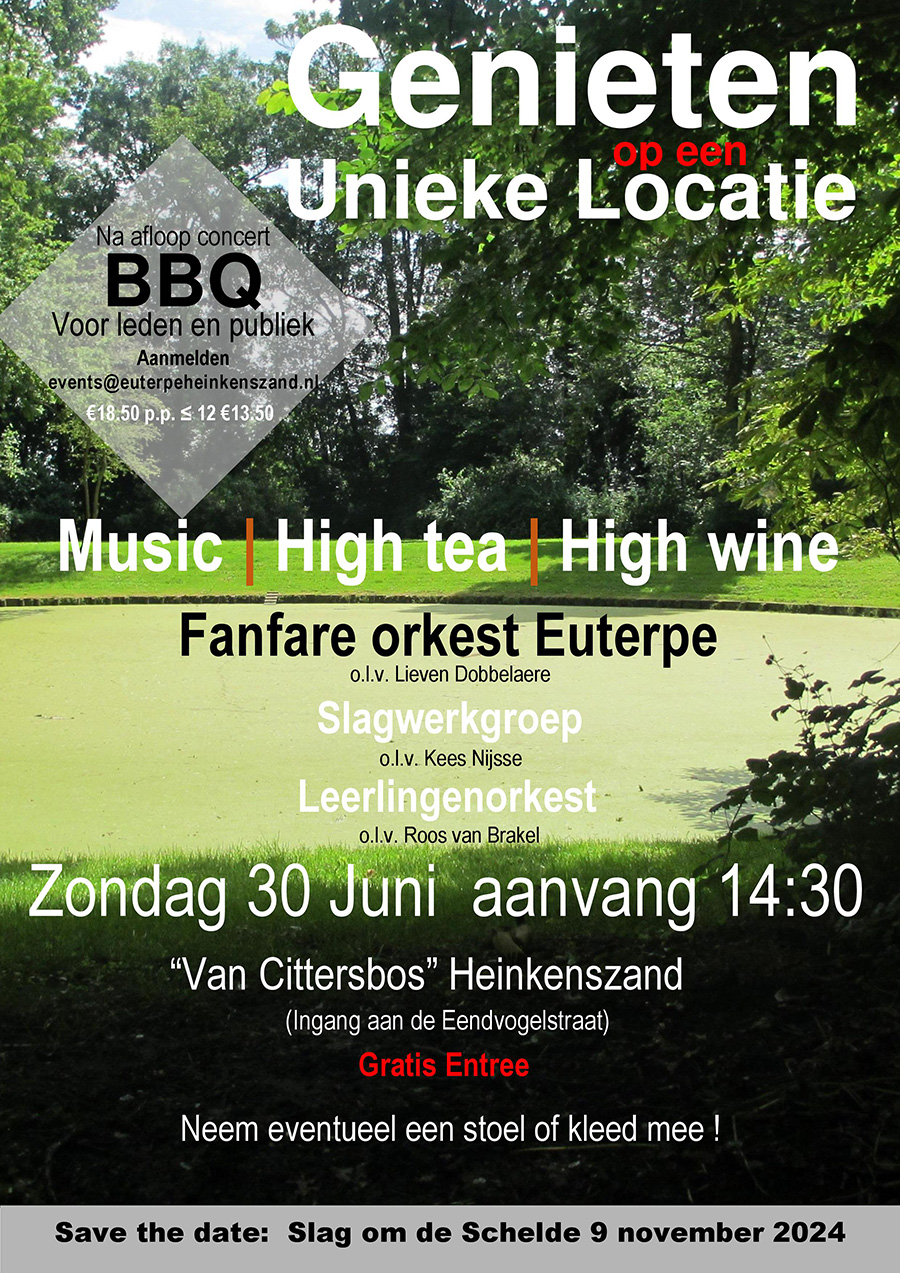 Na het concert is er gelegenheid om te barbecuen. U moet zich hiervoor aanmelden via events@euterpeheinkenszand.nl. De kosten voor de BBQ zijn € 18,50 per persoon. Kinderen tot 12 jaar € 13,50.