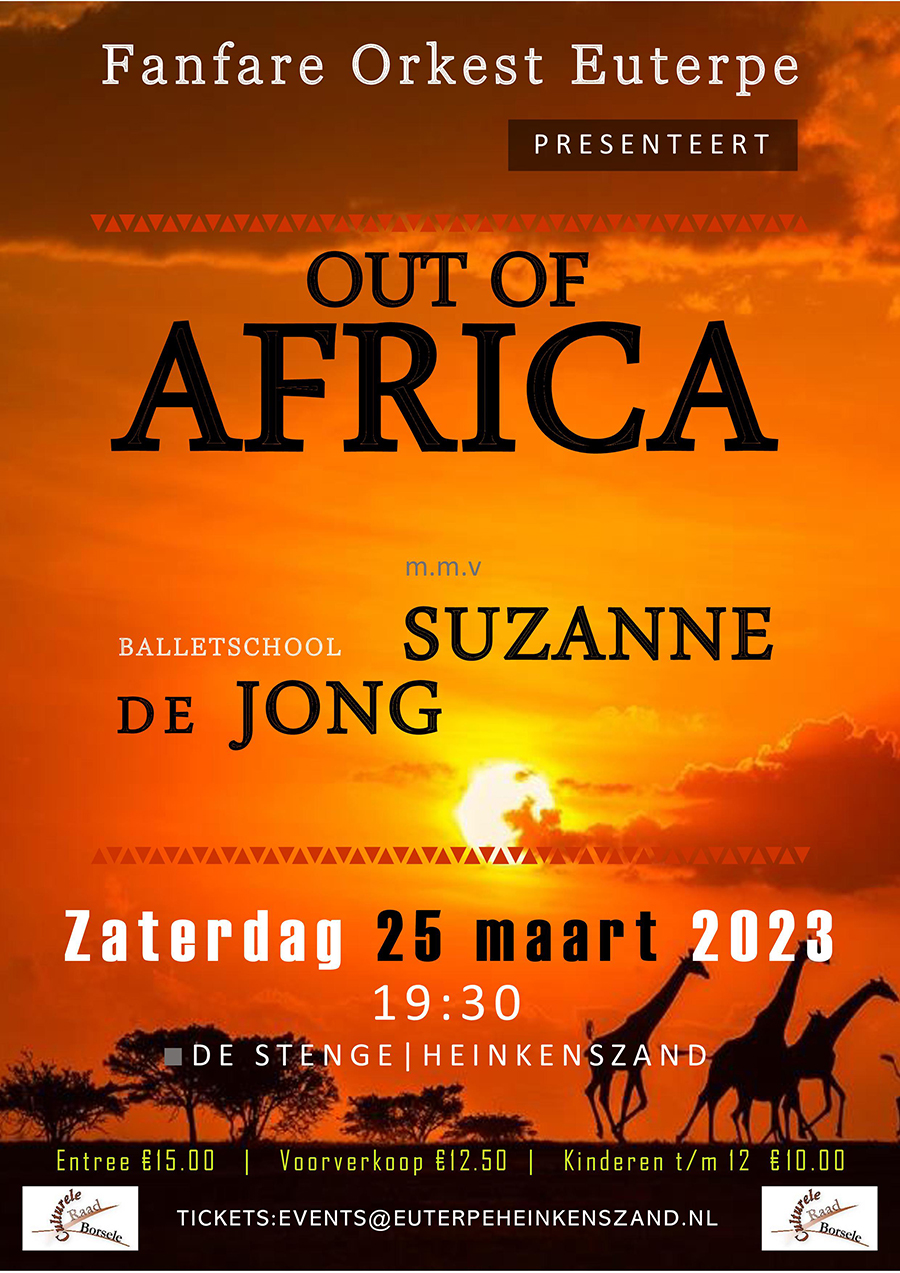 Het thema voor 2023 is "Out of Africa". De fanfare, de slagwerkgroep en balletschool "Suzanne de Jong" nemen u mee naar dit veelzijdige continent.